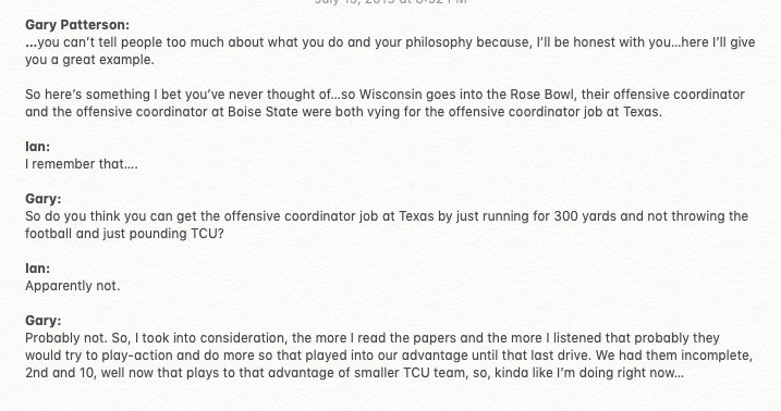 Even if Patterson “knew” the Badgers were going to run play action on first dow, how would that have helped? 20/28 plays TCU would have been expecting the wrong play.